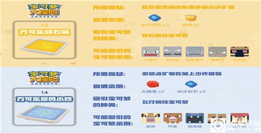 方可乐顽石锅需要放入足量坚硬的东西外加少许矿物,会吸引岩石属性宝可梦,可能吸引到小拳石、大岩蛇、独角犀牛、隆隆石、化石盔等。方可乐旋风小炒里需要大量矿物加上少许植物,会吸引飞行属性的宝可梦,可能吸引到波波、烈雀、超音蝠、嘟嘟、比比鸟等。