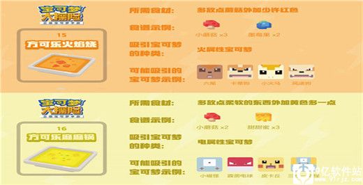 方可乐火焰烧里需要大量蘑菇和少许红色材料,会引来火属性宝可梦,可能吸引六尾、卡蒂狗、小火马、风速狗等。方可乐麻麻锅需要多放点柔软的东西外加一点黄色材料,会引来电属性宝可梦,可能吸引到小磁怪、霹雳电球、皮卡丘、三合一磁怪等。