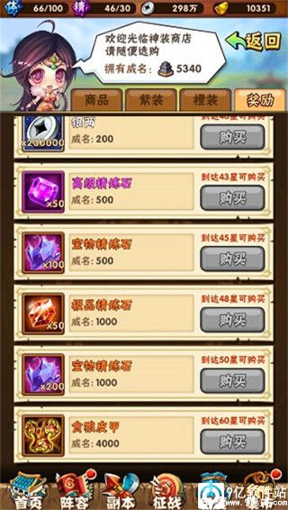 1、三国无双的神装商店购买,需要角色达到40级并且三国无双玩法打到45星星级