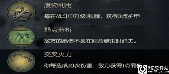 废物利用能帮助增殖流收获大量护甲。增殖弹有3级,复制的增殖弹为1级,增殖弹会越来越多,升级改造强化的范围也就越来越大,大幅度提升了防御力。弱点分析可以让易伤永久存在,易伤就会越叠越高,每回合对敌方造成的伤害也就越来越高。交叉火力能够配合弱点侦查机抽牌,没有弱点侦查机的时候选择该祝福收益会很低。
