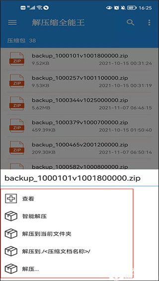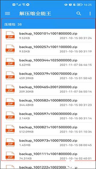 2、之后软件会为你自动扫描手机上的所有压缩包文件。选择你想要进行解压的压缩包。