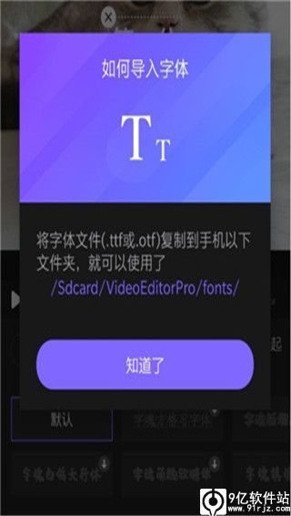 首先点击文字功能,输入要在视频中添加的文字。然后点击右上方的自定义字体,然后就会告诉我将字体文件复制到/SDcard/videoeditorPro/fonts/就可以完成自定义字体的导入了。
