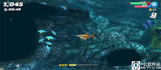 1、玩家控制鲨鱼进入海中猎食,根据鲨鱼的型号会限制玩家可以猎食的对象,鲨鱼的生命值会不断下降,所以玩家只能让持续猎食。