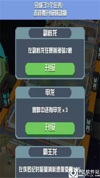 2.侏罗纪动物园消耗体力进行游戏,升级栖息地以及解锁场景都是靠完成侏罗纪公园的任务。侏罗纪公园每3个任务1组,完成以后返回动物园即可进行升级。