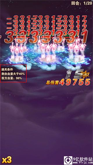 3、在上图中,还可以看到,每个小关卡在挑战之前,有明确的通关目标提示,比如上图的通关条件是“击杀对方全体神将”,此外,还有诸如“剩余血量大于40%”、“必须在6回合内击杀对方”等等变态的要求,所以少年们需要先搞清楚通关的条件,再根据条件来调整合理的站位,方能百战百胜哦。战斗过程中,在屏幕左侧也可以实时看到目标达成的程度。