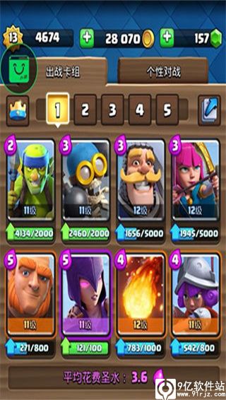 打法:在对方进攻的路线放下女巫清场,女巫快过桥的时候下巨人平推。炸弹人守人海,火枪手、哥布林、弓箭手防守+辅助进攻,骑士防守,火球备不时之需。
