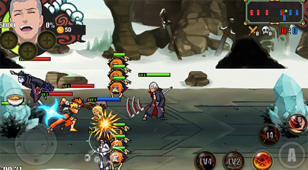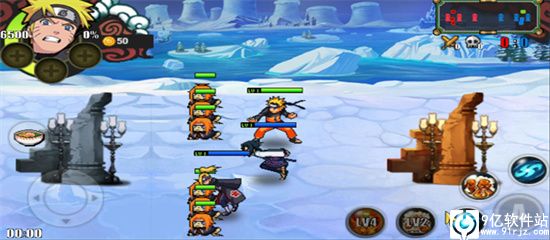 英雄等级上限6级 小兵等级上限3级,英雄的2个奥义技能分别在2级,4级时开启(当局战斗内)奥义技能释放需要承受伤害来获取 查克拉(简称:怒气值)战斗界面中,还有回血技能(回血技能无蓝消耗,但是会消耗当局战斗内金币)