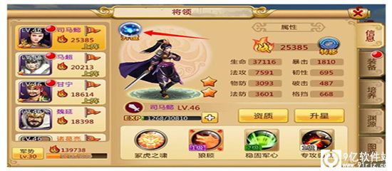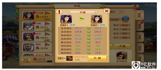 3、以上是紫将升橙和蓝将升橙的对比图,不难发现,由于紫将初始能力较高,因此在升橙后,属性提升并没有蓝将升橙高,因此无论是什么品质的将领,在升橙后其属性是相差无几的。