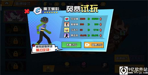 6、同时还可以对人物的生命值、能量值、攻击力、暴击率等进行升级,还可以更换不同的英雄以及皮肤;