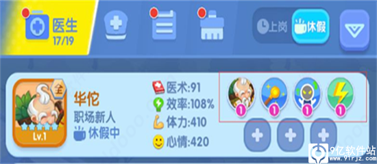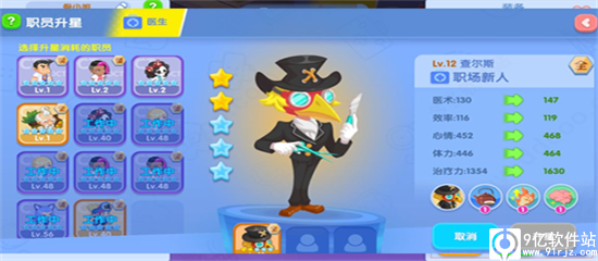 通过医治病人和完成日常订单等任务获取职员经验值对职员进行升级,职员等级达到一定级别的时候可以通过职员证书晋升职员。