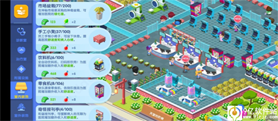 这些装饰是提高医院的绿化和舒适度的,这也影响病人看病的心情,如果病人心情不好了,会直接离开医院,那我们的治疗就算失败了,这样就会降低医院的治愈率了,而且多建点饮料机和零食机还可以赚点病人的钱哦,比买凳子划算。绿化的话,大家可以看出室外的植物加的比室内高,所以尽量买室外的植物或装饰物吧,绿化和装饰物是需要维护的,当上面显示小水滴就是需要浇水,出现扳手就是需要维修,只要点击水滴和扳手就可以了,很方便的。(户外的土地需要开发,开发工具需要铲子和锯子,商店有售,在开发土地的时候还会有小惊喜,可以有机会挖到钻石哦)