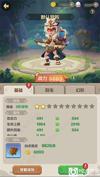 基础界面可以进行背饰的穿戴,和使用剑虎兽皮来强化背饰等级,从而提升背饰的基础属性。当达到一定等级时,则需要消耗祭司圣水来进行等突破。