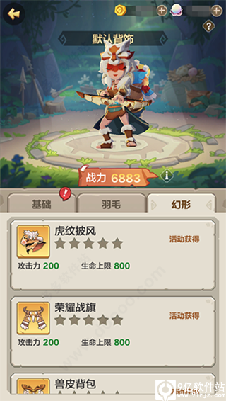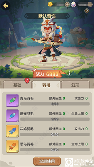 点击进入背饰系统,背饰系统分为3个模块,基础,羽毛,幻形。