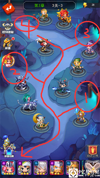 英雄组合搭配:1号口周围建议上高培养和带减速的英雄2号位置选择环型范围性英雄。3、4号位置为技能释放距离较远的为主。