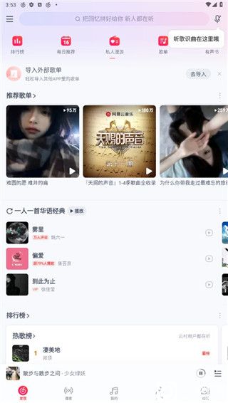 1、打开网易云音乐最新版,主界面第一个就是发现功能,在这里我们可以看到排行榜、每日推荐、歌单等功能