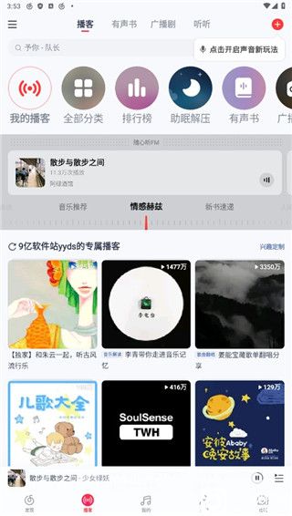 5、用户自上传【主播电台】,音乐故事、脱口秀、情感话题,每个人都能轻松表达自己。