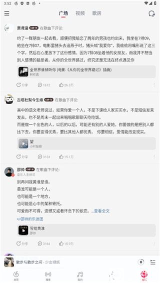 5、社区功能也是就是社区广场了,可以看到很多用户在歌曲下进行评论,里面还有视频和歌房功能哦!