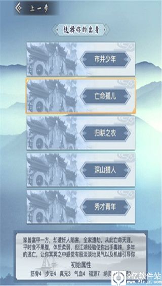 其次,就是出身选择,这款游戏为玩家提供了五个出身选择,每个出生所加的属性都不一样,这边需要玩家慎重选择,小编这里选的是亡命孤儿,纳灵这一属性在游戏中十分难获得,而忘命孤儿一开始就给10点实在难得可贵。