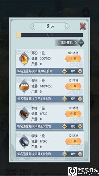 洞府中的灵山用于产出游戏中所需要的资源,而道童的分配就至关重要。开始的道童有5位,每一位道童在工作的时候都需要花费一定的食物(毕竟人家也是要恰饭的啦),而且招募道童也需要一定的量的食物。因此,优先将道童用于生产食物,同时木材的可扩展灵山中各资源产出量,而镔铁主要用于升级聚灵阵,对于玩家前期来说聚灵阵可先放一边,优先将粮食和木材的等级达到20以上。粮食充裕才能吃喝不愁。