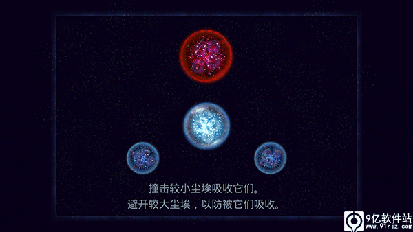 游戏在操作上简直可以说是简单的华丽,没有任何的操作按键,只需要在星云的旁边点击,星云就会喷射出自己的体内物体,然后会向反方向移动。如果想要移动快一点就点击快一点,如果要慢一点就点一下,它就会自己慢慢的移动。至于快慢程度就需要玩家自己把握了,太慢追不上前面的星云,太快了又会失去自己的体积。