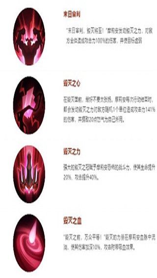在毁灭面前,最好不要太张扬。摩莉安每次行动结束时,都会发动毁灭之力对敌方随机1个单位造成攻击力141%的伤害,并摄取20点怒气为自己所用。