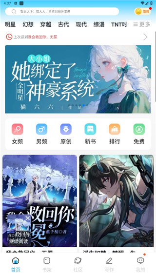包括了精选、女频、男频等个性页面,您可以根据自己的喜好查看相应的推荐书籍,每一本书都来自友读编辑部的精挑细选。此外,您还可以查看到书籍的人气榜单、书库的分类展示等;