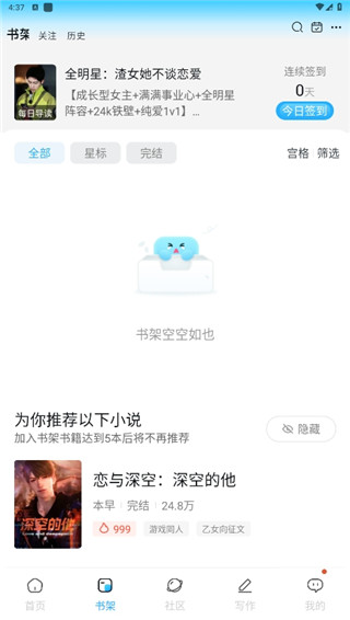 2、在书架把控中,可以看到你加入书架的书籍。并且系统还会为你推送小说