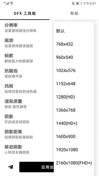 1、分辨率:设置游戏的最佳分辨率2、画面品质:为您的设备选择最佳画面品质