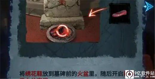 11、将获得的绣花鞋放到墓碑前的火盆中,打开密室的大门之后进入密室。
