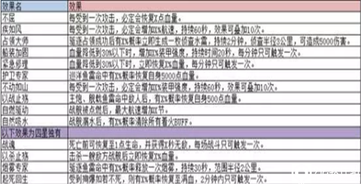 作用: 增加2%的战舰血量,减少5%的驱主炮伤害,当伤害到一定比例时获得一千炮速和十节鱼雷航速(持续3分钟),升至少将后触发战魂时获得五千血,但每秒失去五十点血(最好带紧急维修),升至中将时减少暴伤30%,升至时元帅死亡后为九公里范围内三个队友增加46%以上的血量