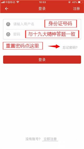 小贴士:登录账号为党员身份证号码,如果忘记登录密码需要重新设置密码,可以点击“忘记密码?”按钮,按照提示重置密码。