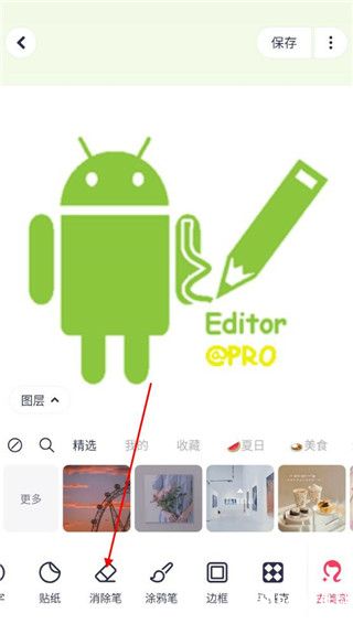 4、进入到图片美化页面,我们在底部滑动菜单中找到“消除笔”并点击使用