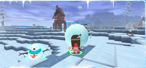 使用聚物手套,点击方块上的积雪即可生成雪球,进入推雪球状态,雪球还会越滚越大,对着雪球蓄力,可将雪球推至远处。推雪球状态下,将相邻两格的雪球堆叠成雪人,再用收集到的细树枝、棉花、枯灌木丛、松果、树叶装扮雪人,完成后就用冰灵精粹可以激活它。