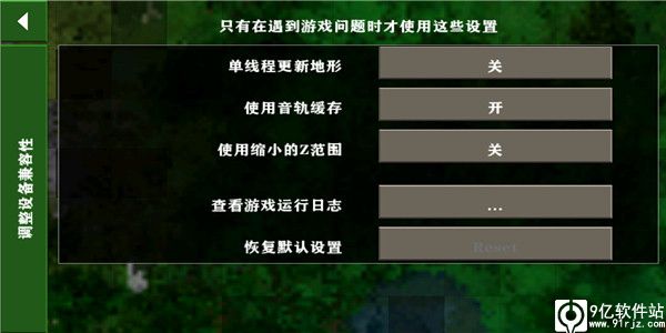 8、设备兼容呢只有在你遇到游戏问题时才会使用,可以对单线程更新地形、使用音轨缓存、使用缩小的Z范围等进行设置调整