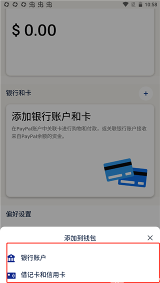 点击‘添加银行账户和卡’再点击‘借记卡和信用卡’