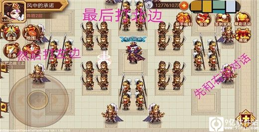 第一层,兵阵塔破阵语:方阵,厚方薄中,穴在东方!意思很明了,方形阵,四方实力雄厚,中间兵力薄弱,破阵的弱点在大阵的东方。破阵时先打东方弱点,然后打阵法中间破阵。破阵奖励陈宫专属和功勋值。