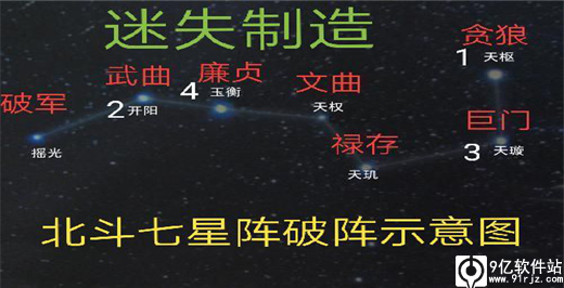 第九层破阵语贪狼武曲巨门廉贞。道教称北斗七星为七元解厄星君。