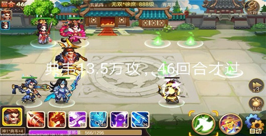 2.第二回合。第二回合为加速、减速和进攻回合。本回合,邓艾、赵云、大乔都有大招。邓艾一速放大,貂蝉二速给典韦杜康酒,赵云三速放大招,典韦输出放技能打最上面的弓手和谋士,大乔放大招。有个小技巧,记住:奇数回合为控制回合、偶数回合为加减速、攻击回合(当然如果你四星赵云邓艾不同)。