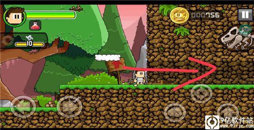 1-11、如图,在这里向上跳触发机关(再往前一点就是商店了)