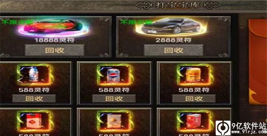 游戏中各位玩家可以通过打宝宝库的回收功能,进行搬砖的操作,每天正常有5次的回收机会,每次都是通过588以上的灵符进行回收,如果大家打到宝库里面指定的一些宝物,都可以通过宝库进行回收,兑换成灵符,最高的有18888灵符。
