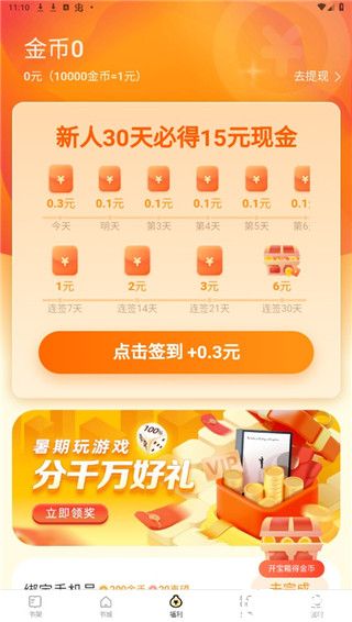 2、在福利频道呢则是这款软件的独特之处了,你可以进行每天签到领取金币,新人30天签到即可获得15元现金哦