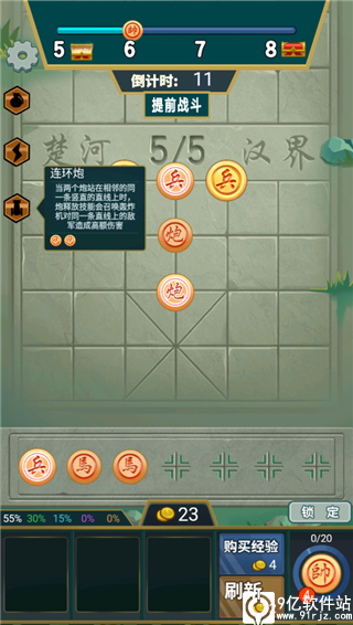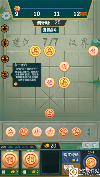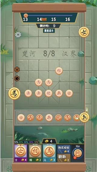 在像棋不象棋无限金币版游戏中,还有比较特别的经验值,一级棋盘上只能上两个棋子,以此类推,每个回合结束会提升两点经验值,也可以通过金币提升,每个等级升级所需的经验值也不同,等级越高所需的经验值也就越高。另外就是棋子出现的概率,这个也是和等级相挂钩,例如一级只会有兵一个棋子出现,需要获取强大的棋子就需要提升等级。