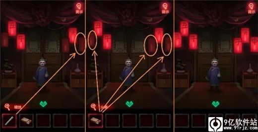 10、在餐桌房用剪刀在纸火盆上剪下红布,用红布在大堂擦拭二老照片获得图案密码。