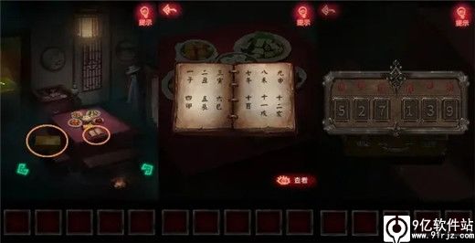 4、在餐桌房,根据纸人小孩所在房间的灯笼和饭桌上的书,获得箱子密码:527139,打开箱子。