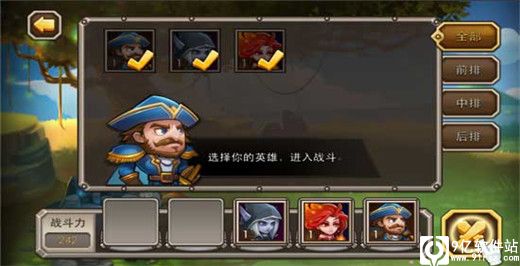 2、在游戏的战斗开始前,我们首先要配置自己的英雄队伍,点击英雄头像将英雄加入到队伍中,英雄可以分为前中后三种站位类型,且一个队伍只能容纳五位英雄