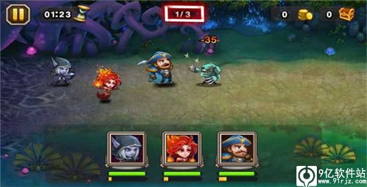 4、游戏的底部是玩家的英雄状态,绿色的生命值和黄色的怒气,当我们怒气攒满后点击英雄头像即可释放强大技能,在游戏的一个关卡内,每一波的怒气都可以继承
