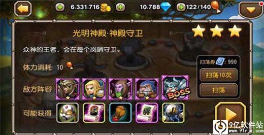 7、当我们三星通关副本后,还可以对已经通关的三星副本进行扫荡,让你一秒通关快速刷取自己想要的材料和道具