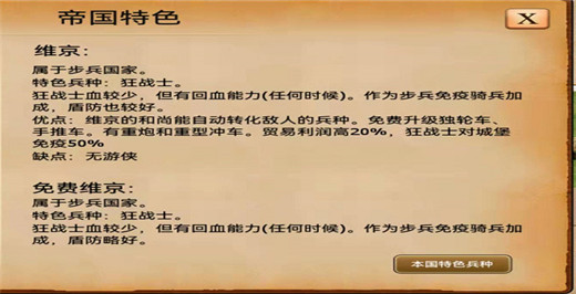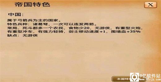 中国这东西,说强强,说弱也弱,看你怎么玩,首先诸葛作为特色兵种是非常强的,一个顶两个普通弓箭,非常厉害,但是遇到马爆,只有呵呵,建议玩混兵种,开局建4个城堡,4个马场,4个步兵营,五个铁匠铺,先升级除了围墙以外的全部科技。新手应该60个兵差不多,农民15个,开采黄金,不要分开开采,主要开采黄金,然后保证10个弓箭以上,15个最好,然后10个勇者剑士,10个重骑兵,你只要控制全部诸葛兵就可以,然后上去打,我敢说马爆遇到你也要完,你只要猥琐一点打,缩在城堡内,一般新手都是让骑兵自己去打,不控制,如果刻意切你,你就全部聚集起来,然后弓兵单独出去,一般来说就能用很少的损失把对方骑兵全歼,这方法对很多出单独兵种的国家都有效,前期你靠中国就能杀遍全场,毕竟新手都是只出一种兵种
