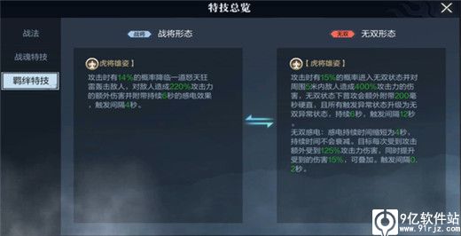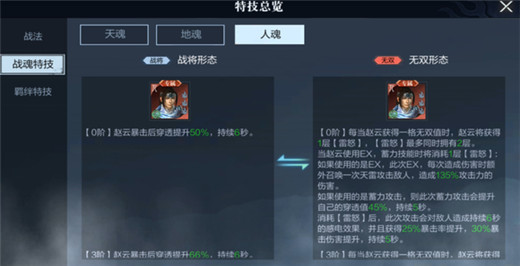 无双觉醒不仅武将自身会进阶升级,他所拥有的羁绊特技也会得到提升,以无双赵云为例。