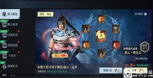 每次招募未获得大奖时,将提升一点运势;当累计运势达到上限后,下次招募必定获得大奖。本期大奖为赵云·恢弘志,可以用于激活赵云的无双形态。